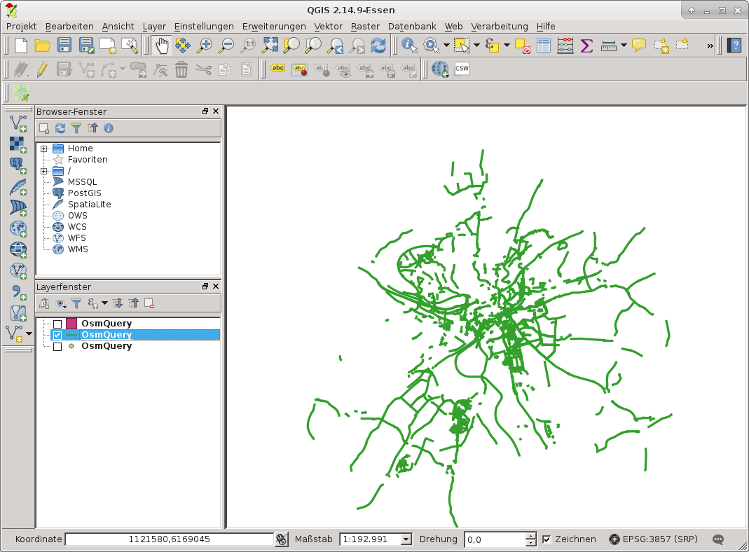 Nachdem die Abfrage erfolgreich ausgeführt wurde, werden die Daten in drei Layern dargestellt, jeweils ein Layer für Punkte, Wege und Polygone. In unserem Fall verwenden wir nur den Wege-Layer und löschen oder deaktivieren die beiden anderen Layer. Overpass-Abfrage Darstellung der abgefragten Daten